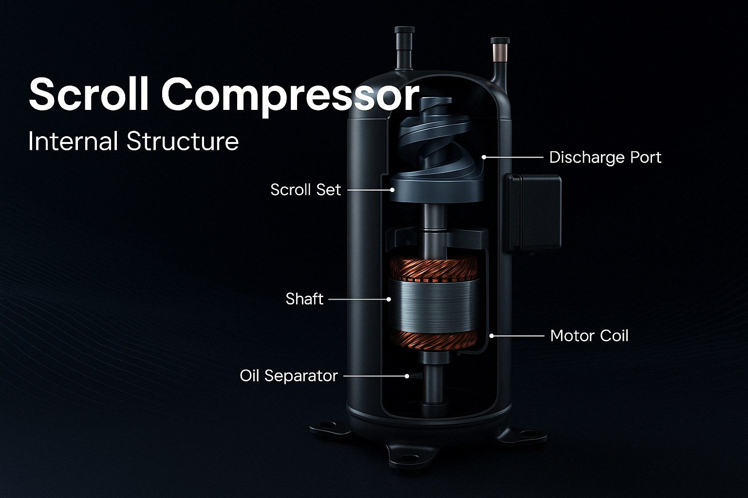 Zwei Spiralelemente komprimieren das Kältemittel, indem sie den Raum zwischen ihnen schrittweise reduzieren. Diese werden üblicherweise in Wärmepumpen -Kompressor -Setups aufgrund von hoher Effizienz und geringem Geräusch verwendet.